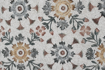 Plastik mixt sie mit traditionellen Materialien wie Marmor und Smalten und kreiert daraus Mosaiken, die ihre Faszination für Stoffe und Muster widerspiegeln.